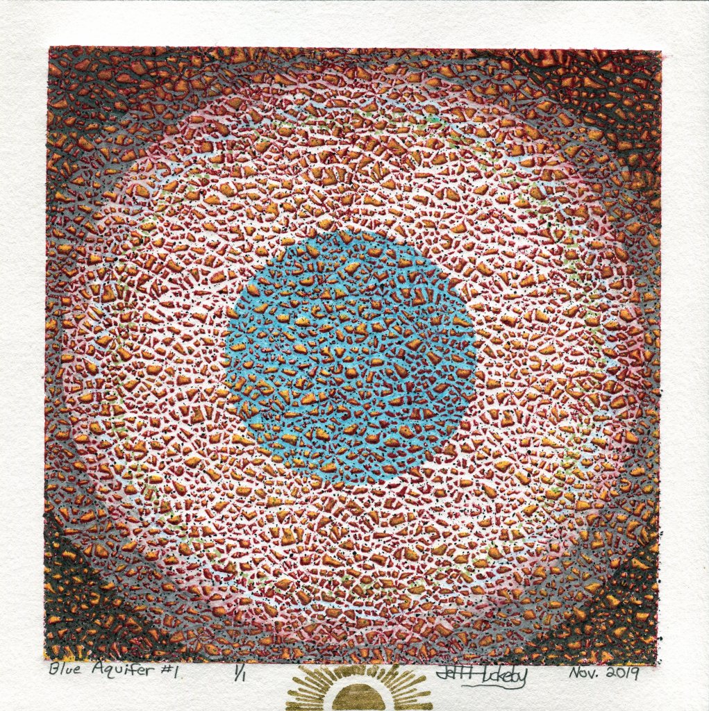 I have dabbled in printmaking for years, but I began producing prints regularly in 2012. I have done lino block, woodblock, relief, and mono prints. Recently, I have been developing a printmaking technique I have called mechanitechnographs. These are relief prints produced by inking and printing the surfaces of mechanical and electronic parts.